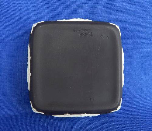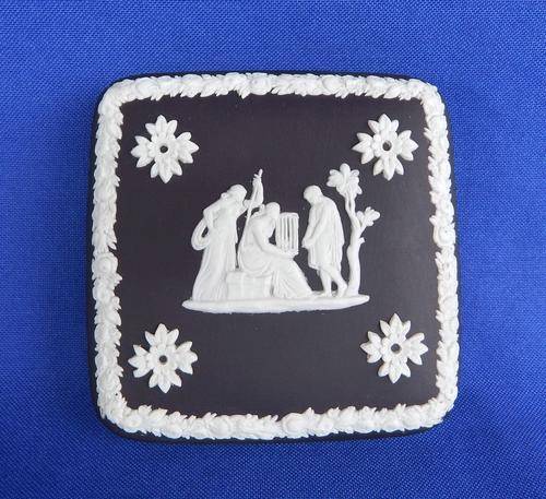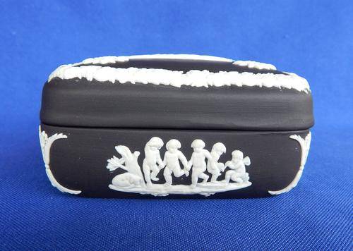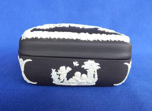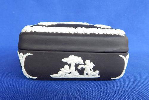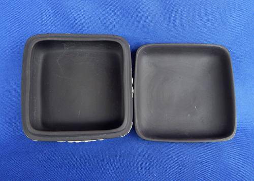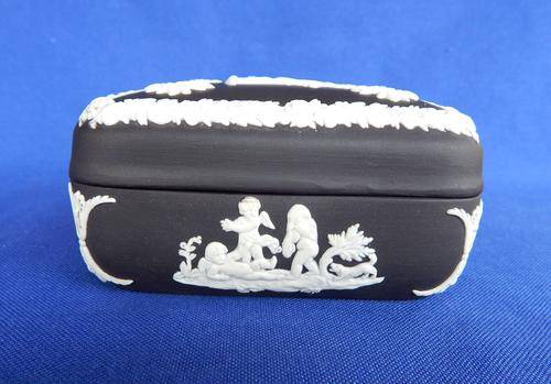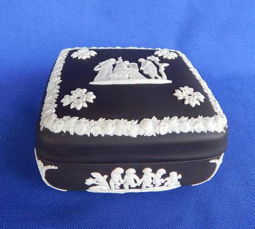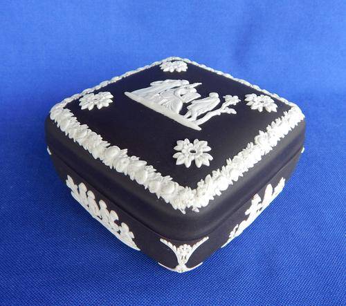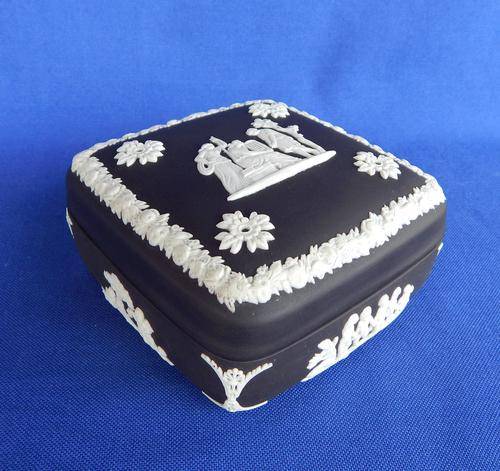 This Wedgwood, made in England, Black Jasper Ware Lidded Square Trinket Box features a Classical Scene on top with a Floral Border and Cherub Scenes on the sides.