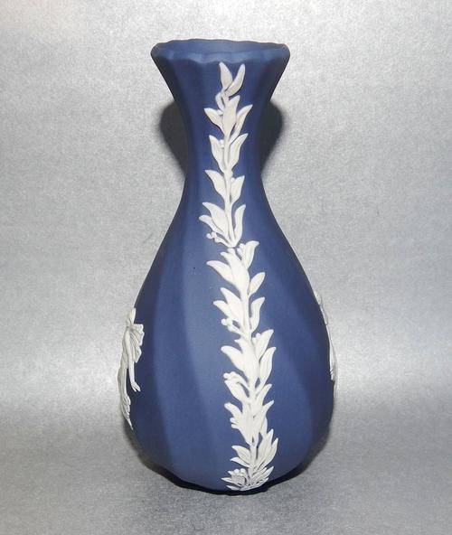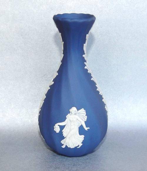 This is a Wedgwood, Made In England, Portland Blue Jasper Ware "Flora Girl" Fluted Vase with Laurel Trim.