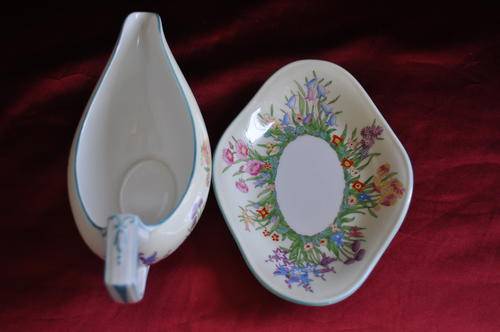 Saucer: 19,5 cm x 14 cm. Gravy Boat: spout to handle 20,5 cm x 9,5 cm wide, x 11 cm high.