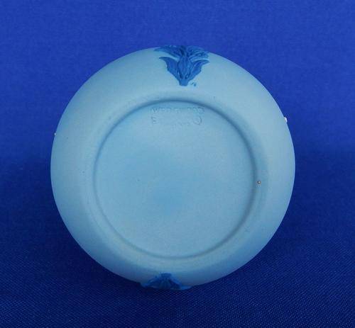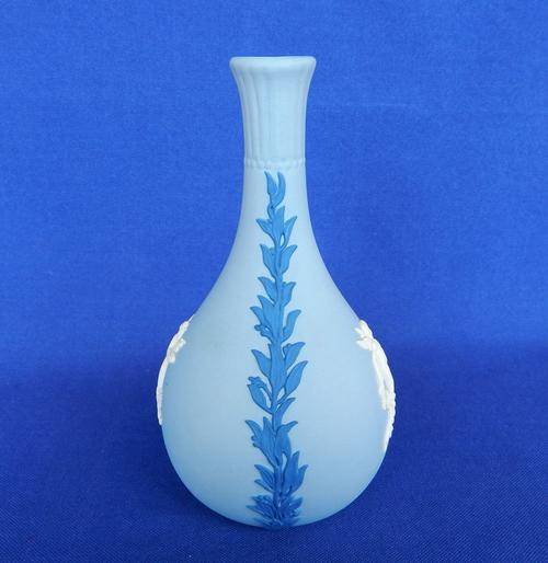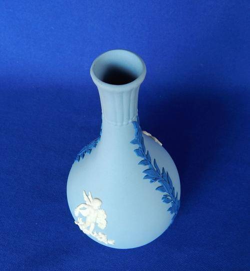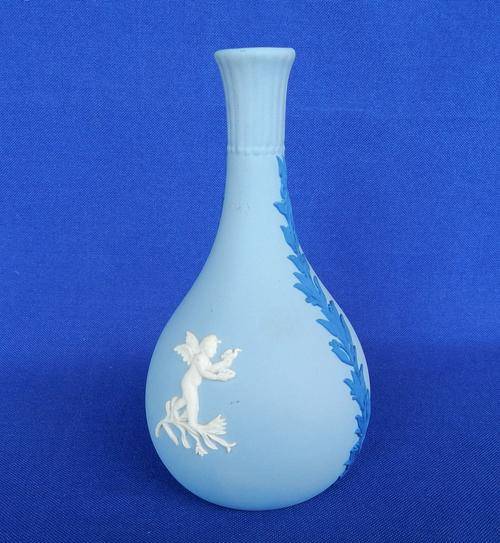 This Wedgwood, made in England, Tri Colour Blue Jasper Ware Bud Vase features Cupid Scenes with Laurel Trim.