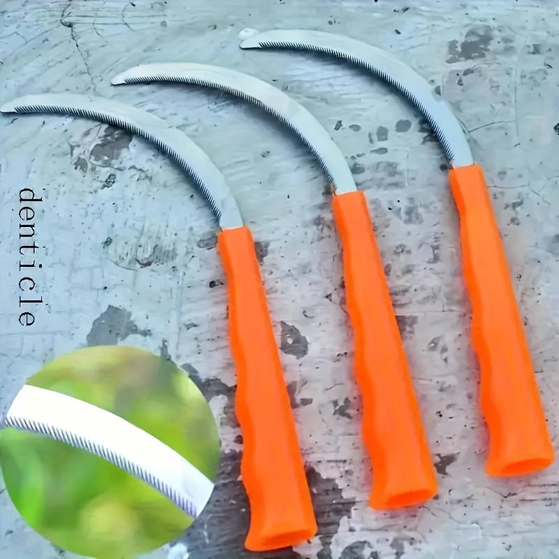 One stainless steel serrated blade with plastic handle, outdoor gardening tool, weed eater, one crescent hand sickle, lawn sickle