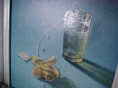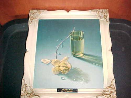 AS I AM NO ART PROFESSIONAL I CAN ONLY TELL YOU WHAT I SEE HERE. THE INSIDE MEASURES 22CM BY 25CM. IT APPEARS TO BE A PRINT AND IT LOOKS LIKE SOMEONE HAS PUT LIKE A VARNISH ON THE ACTUAL ROSE AND GLASS. THE OVERALL PICTURE LOOKS LOVELY AND FRAME IN GOOD CONDITION. IT IS A LITTLE PLAQUE THAT WAS PUT ON THE FRAME.