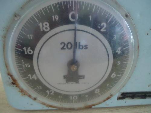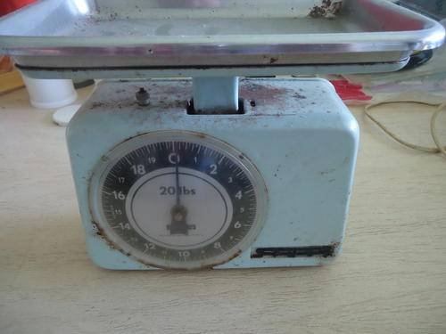 WEST GERMAN PASTEL TURQUOISE COLOUR "STUBE" 20 LBS KITCHEN SCALE WITH TRAY MEASURES 21.5 CM IN HEIGHT BY 23 CM WIDE AND HAS A DEPTH OF 15 CM AT IT'S DEEPEST