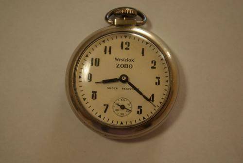 Westclox Zobo shock resistant. Watch face diameter, including the metal outer ring = 50 mm. The clock ticks and winds up. It is not possible to set the time due to the winding crown being loose. Postage is R35 (I have 2 other pocket watches listed for this week. All 3 can be combined and posted for R35).