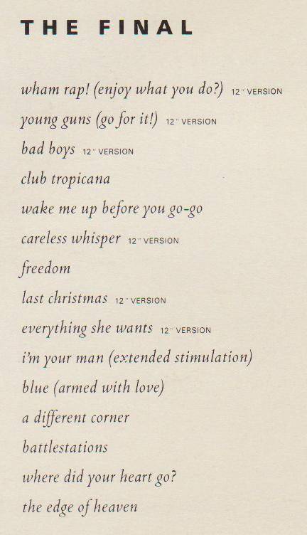 Wham ! , The Final (2 LP Set). This double LP set was made in 1986 by Epic and is in excellent condition, as is the cover, which includes original picture record-holding sleeves.