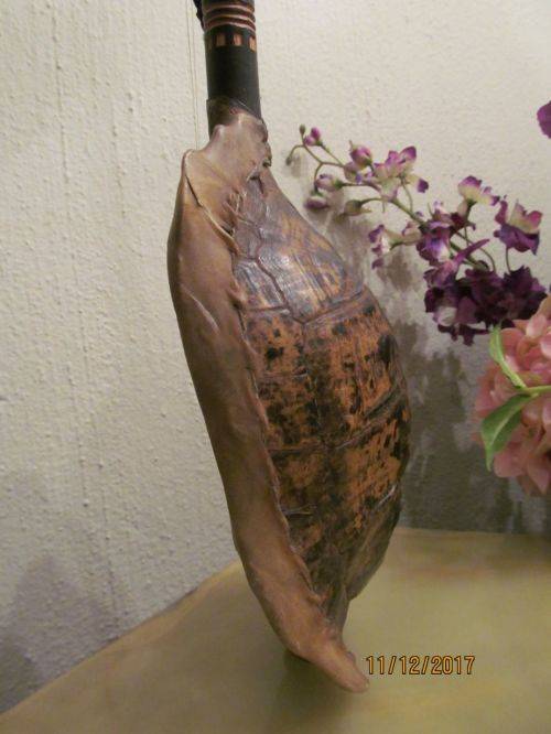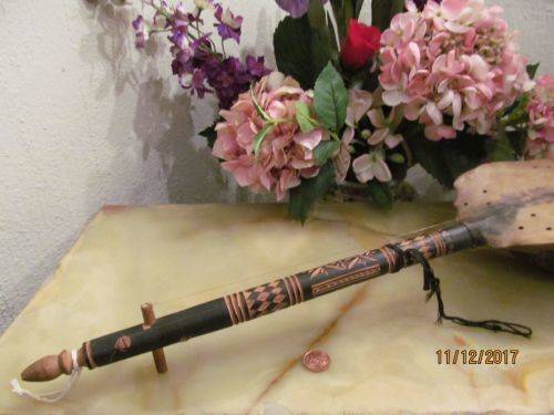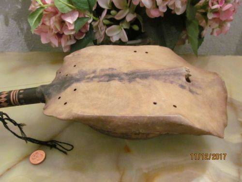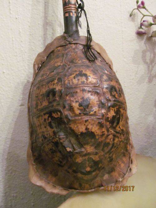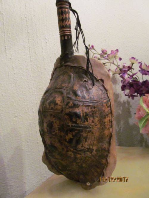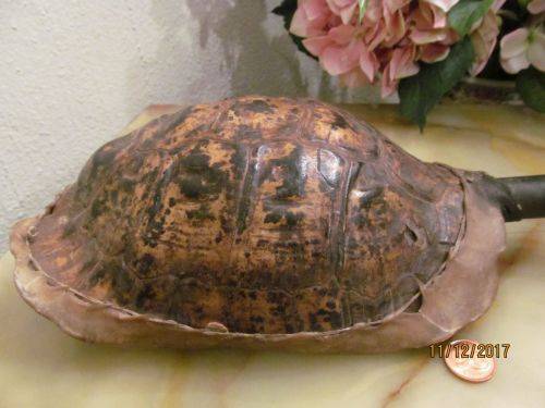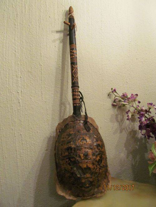 THIS RARE VINTAGE MUSICAL INSTRUMENT IS FROM MOROCCO AND IS KNOWN AS A GUNIBRI. THIS PARTICULAR ONE IS CRAFTED FROM A GENUINE TORTOISE SHELL WITH THICK SKIN PULLED TIGHT AND SECURED UNDERNEATH. THE USE OF THE TORTOISE SHELL RESULTS IN THIS RARE ITEM BEING KNOWN AS A FAKROUN (TORTOISE) GUNIBRI. A SERIES OF PERFECTLY CYLINDRICAL HOLES HAVE BEEN MADE IN THE SKIN WHICH ASSISTS WITH SOUND QUALITY WHEN THE ITEM IS STRUMMED. THE WOOD STEM IS BLACK WITH CARVED PATTERNS AND TWO NYLON STRINGS ARE ATTACHED TO WOOD SHAFTS/PEGS INSERTED INTO HOLES AT THE TOP OF THE STEM. ONE HOLE IS VACANT MEANING A THIRD STRING IS MISSING. THIS COULD EASILY BE REPAIRED BY MERELY INSERTING ANOTHER PEG/SHAFT AND ATTACHING A LENGTH OF GUT / NYLON