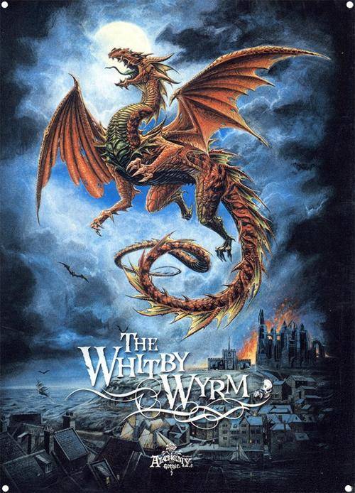 Fantasy Art Metal Sign: As a city burns to the ground in the backdrop to this dramatic tin sign from Alchemy Gothic, the 'Whitby Wyrm' celebrates his enraged victory as he soars off into the night sky. Bats follow his lead in circling the small town, as a lone ship can be seen struggling in stormy seas. With the whole town and its surroundings slipping into complete darkness, this impressive dragon has certainly won this round. With amazing intricacy and detailed imagery, this Gothic masterpiece from Alchemy would make the perfect addition to any fantasy art fans collection.