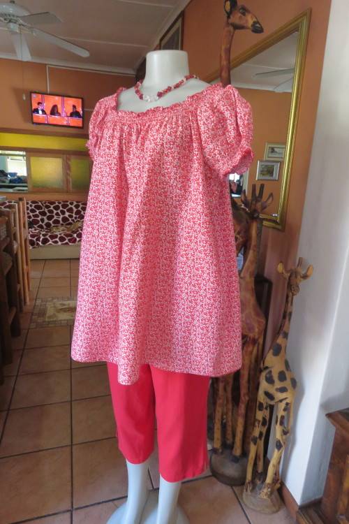White 100% cotton wide cut top with small red Floral pattern. Size 46/22. By 'Exact'. Scooped elasticated neckline and armholes. Pull over style in good condition.
