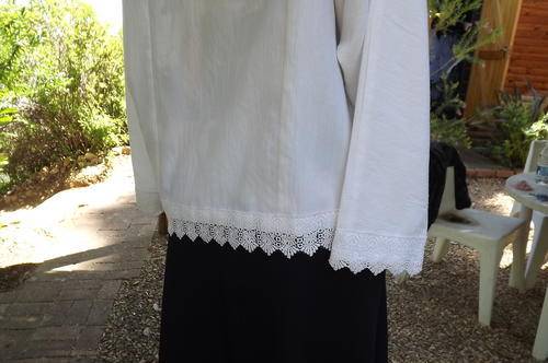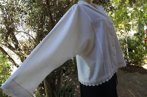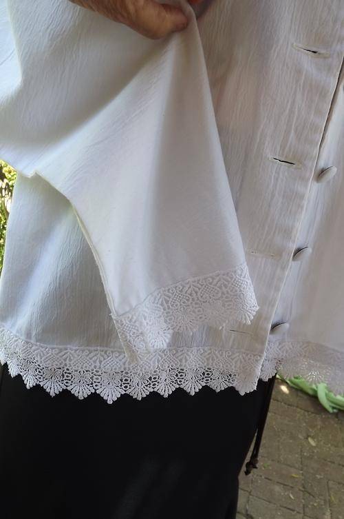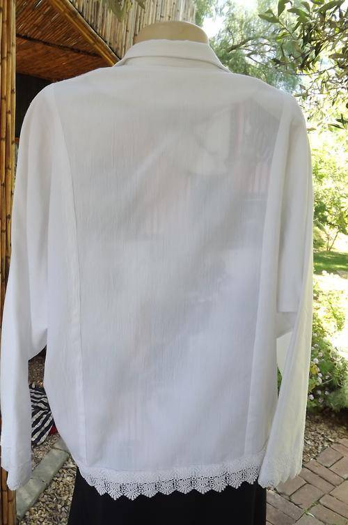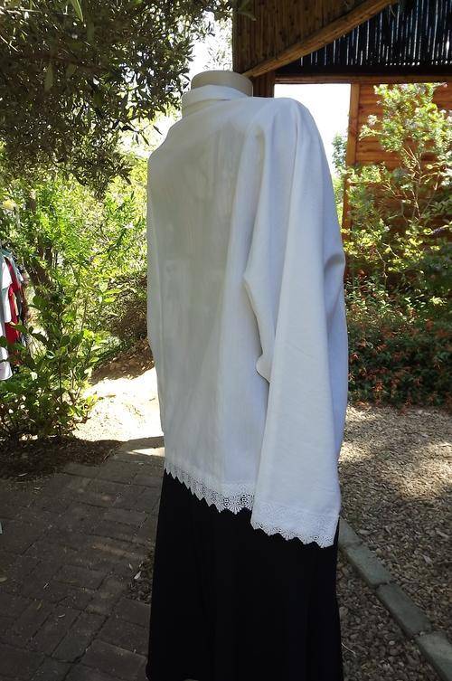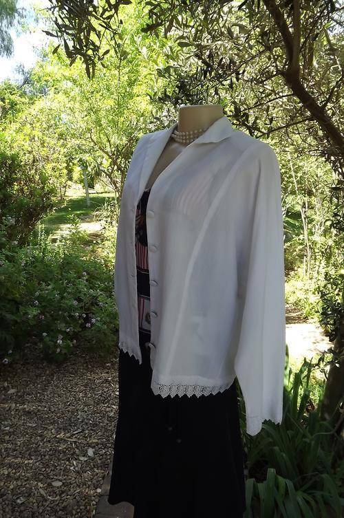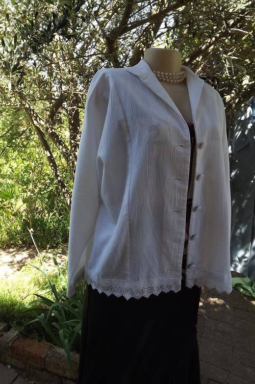 White button down jacket/top with dolman sleeves.Size 40/16.Made by previous owner.In creased textured cotton fabric.Fabric covered buttons.Lace decored on cuffs and seam.Good condition