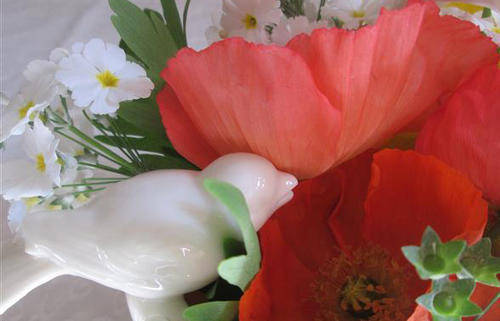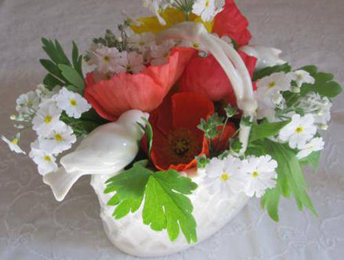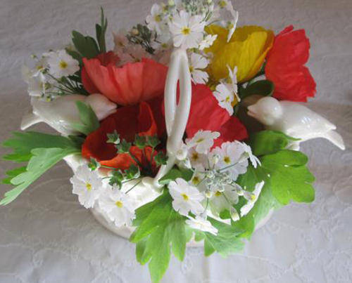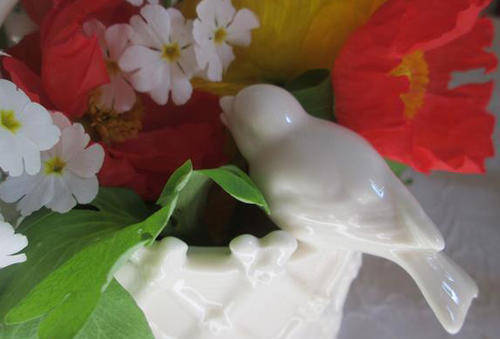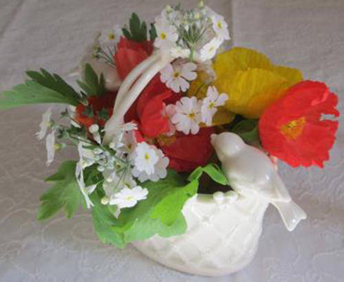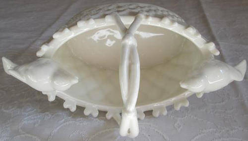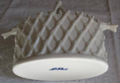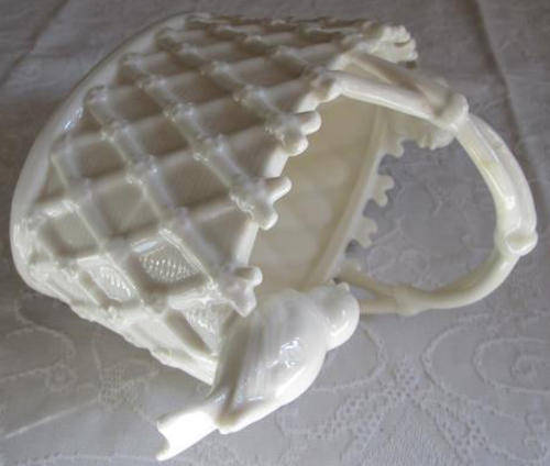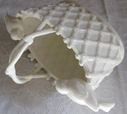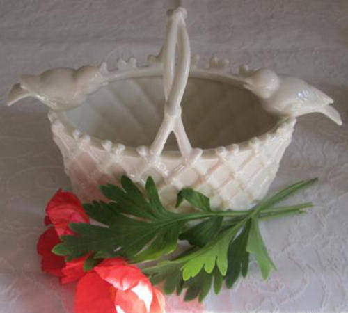 WHITE CERAMIC CONTAINER / VASE DESIGNED AS A BASKET WITH TWO BIRDS, IN PERFECT CONDITION, HEIGHT 12.5cm, LENGTH 13.2cm, WIDTH 8.5cm.