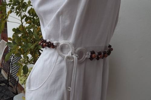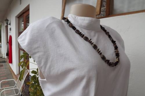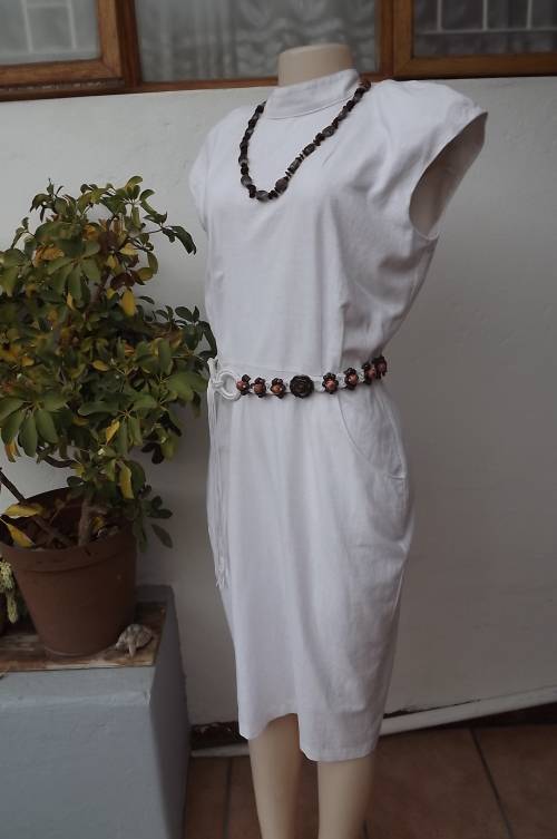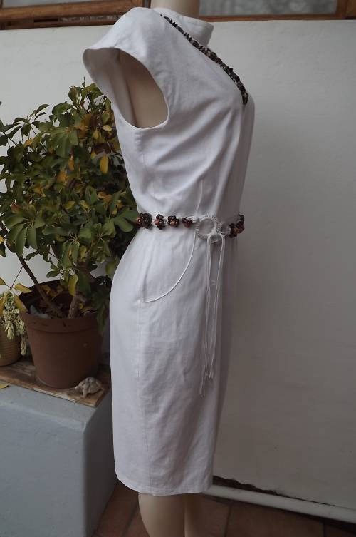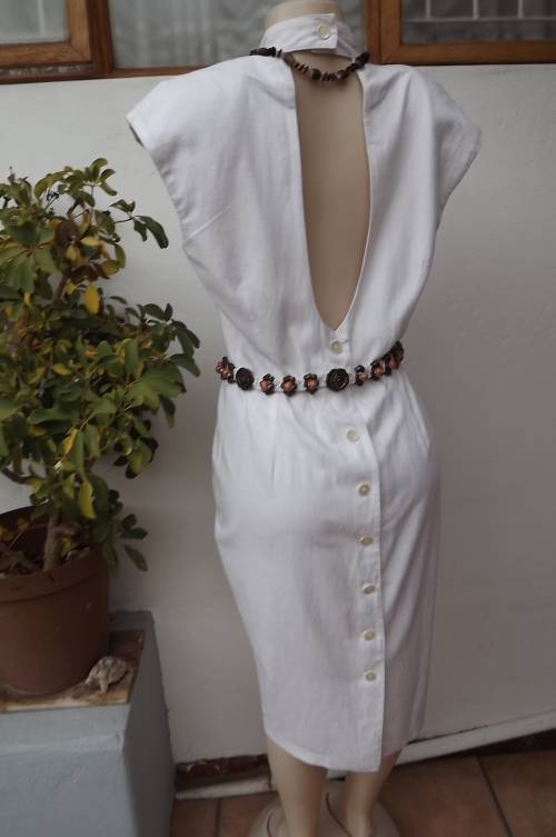 White cotton/linen vintage dress with very sexy button down back.Size 36/12 by Wild Rose.Two side pockets on front.Banded high collar fastening at back.With shoulder cushions.As new.Belt included.