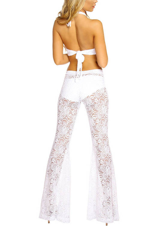 Spice up your look in this Lace Halter Top and Bell Bottom Pant Set featuring sheer floral lace, high neck with halter ties, and back lace ties. Put a modern spin on a favorite classic in this lace bell bottom pant featuring floral lace and a thick lace waistband.