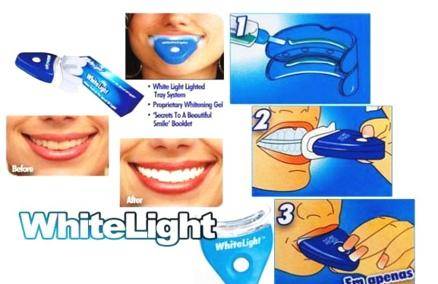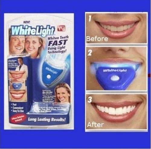 WHITE LIGHT- A REVOLTIONARY NEW SYSTEM THAT INCORPORATES LIGHT TECHNOLOGY AND A SPECIALLY FORMULATED GEL TO WHITEN YOUR TEETH FAST. THE WHITENING SYSTEM RAPIDLY REMOVES SURFACE STAINS AND PENETRATES DEEP TO REMOVE EMBEDDED STAINS. NOW YOU CAN EASILY AND EFFECTIVELY WHITEN YOUR TEETH AT HOME.