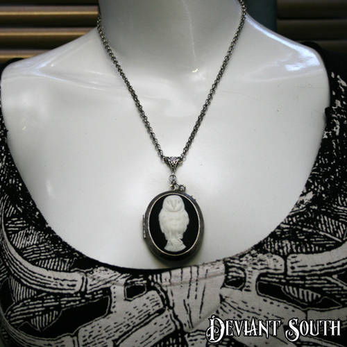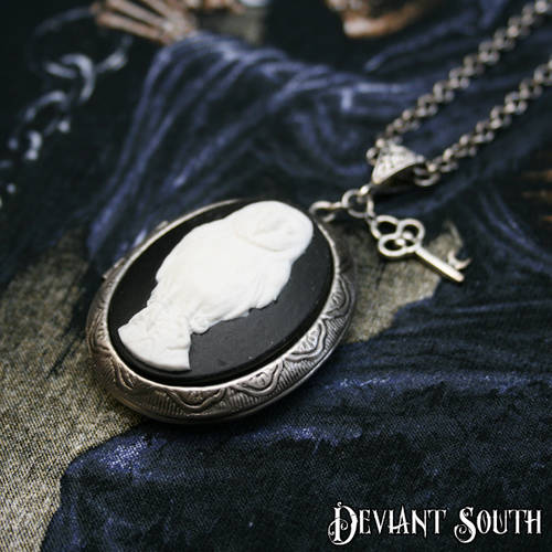 Beautiful antique-silver finish locket which holds two photos. Features resin white on black 30x40mm cameo. Locket strung on a silver chain with key charm. Hand assembled by Deviant South in South Africa. Materials sourced across the globe.