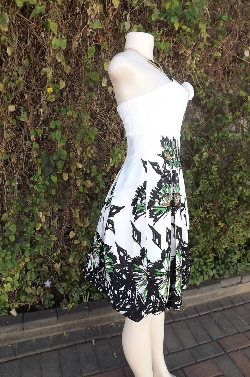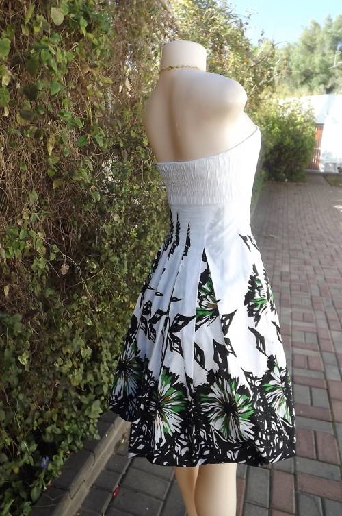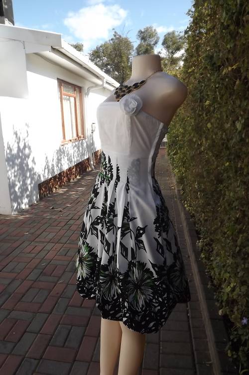 White strapless cotton dress size 30/6 with charming black and green nature design on baloon skirt by LEGIT.Elasticated top back.Fabric flower on front.Pleated skirt.Fully lined.Good condition