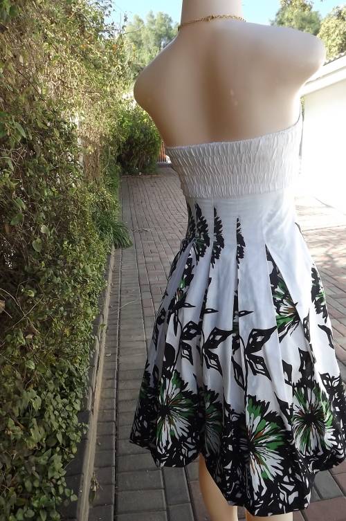 White strapless cotton dress size 30/6 with charming black and green nature design on baloon skirt