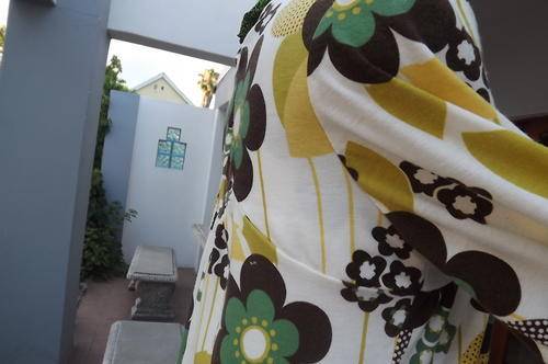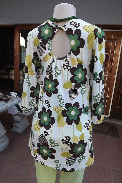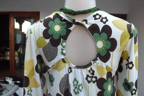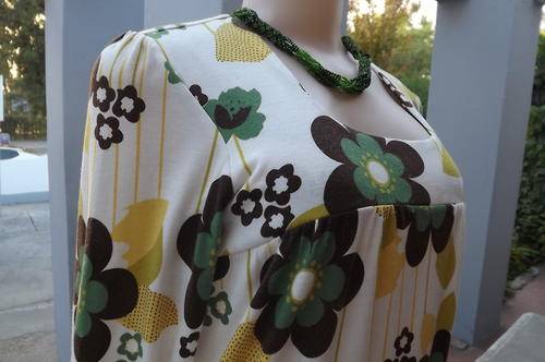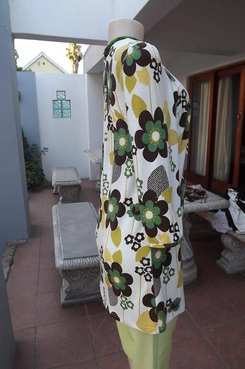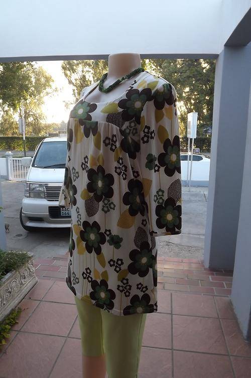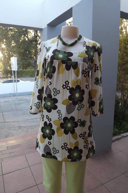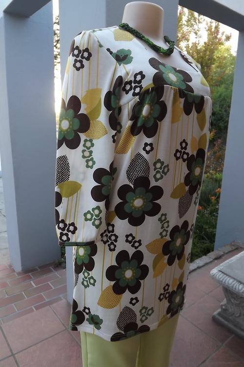 White top/short dress in brown/green floral pattern.Size 32/8.Yoked gathered front with peephole at back.Stretch Spun polyester. ( T shirt fabric) Good condition