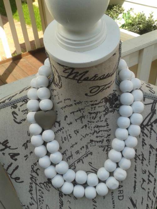 White Wooden Beads Necklace with Heart and double Bracelet Set