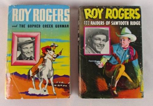 TWO AUTHORISED HARD COVER EDITIONS PUBLISHED BY WHITMAN PUBLISHING COMPANY - ROY ROGERS AND THE RAIDERS OF SAWTOOTH RIDGE (1946) AND ROY ROGERS AND THE GOPHER CREEK GUNMAN (1945) BOTH BOOKS STILL HAVE THEIR ORIGINAL DUST COVERS - ONE COVER IN GOOD CONDITION AND THE OTHER COVER WITH REPAIR. PAGES HAVE YELLOWED WITH AGE BUT OTHER THAN THAT BOTH BOOKS IN VERY GOOD, CLEAN, TIGHTLY BOUND CONDITION. BOTH 50CM X 43CM WITH 246 AND 248 PAGES RESPECTIVELY. REFER IMAGES