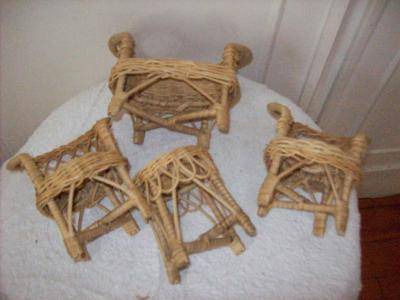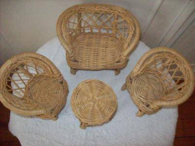 A lovely set of dolls garden furniture, this is a wicker set and is beautifully made, it is in good condition and measures Table 85mm high 100mm dia, couch 120mm high 170mm long, chairs 115mm high 120mm wide.