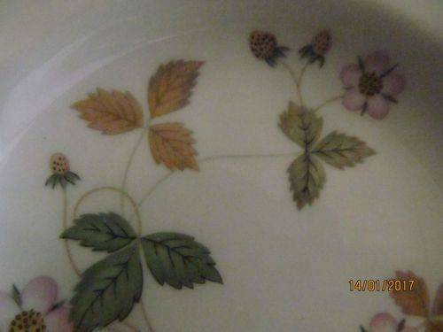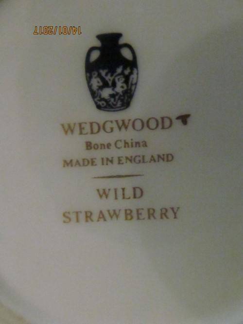 Stamped underneath -- "WEDGWOOD Bone China, Made in England, Wild Strawberry"