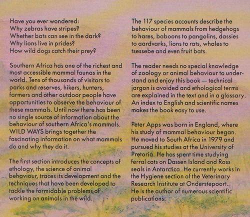 Wild Ways By Peter Apps - Field Guide To The Behaviour Of Southern African Mammals, published in 1997, 197 pages, slightly larger softcover, slight scuffing etc otherwise all good.