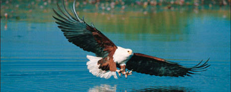 With its distinctive plumage and evocative cry, the African fish-eagle is probably the most familiar bird of prey in Africa. Perched majestically on a high branch, the contrast between the white upper-body and tail, the chestnut belly, and the black wings, is unmistakeable. Much less striking is the almost scruffy appearance of the immature African fish-eagle, with its generally dark-brown plumage and white mottling. Although after the first year the plumage begins to resemble that of the adult, it will take at least four to five years and numerous moults to reach full maturity. The clear, ringing call weee-ah hyo-hyo-hyo, made with the head thrown back, has to be the most characteristic and evocative sound of African watersides.