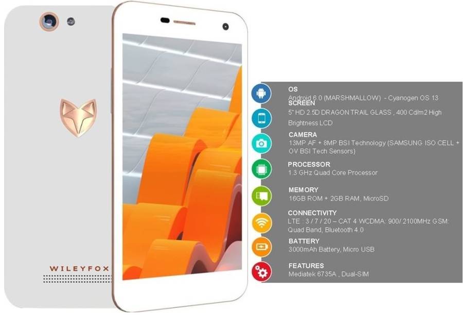 The Wileyfox Spark + (Plus) Smartphone features Primary 13-megapixel Rear-facing camera with Auto Focus (AF)and a Secondary 8.0-megapixel camera on the Front , a MicroSD slot to upgrade the external storage capacity up to 32GB. It also comes standard with LTE with fall back to 3G and 2G bands and Wi-Fi in the 802.11 b/g/n connectivity. The Dual Sim capability gives you the flexibility to have two data networks on a single handset. It also has a range of extra features such as 3.5mm audio jack, Bluetooth Ver. 4.1, A-GPS, FM radio and a Removable Li-Ion 2200 mAh battery.