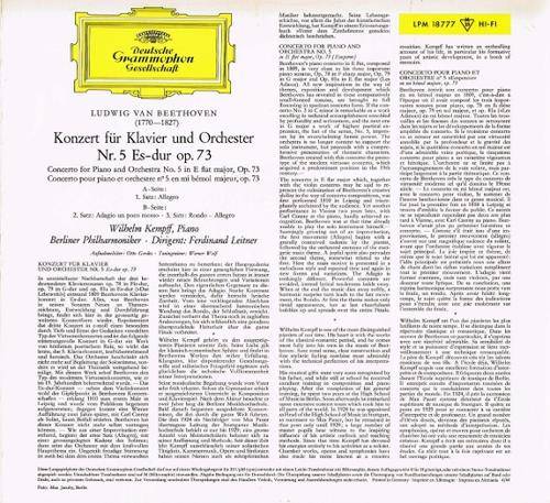 1964 German DEUTSCHE GRAMMOPHON GESELLSCHAFT Mono pressing, release number LPM 18 777, of album LUDWIG VAN BEETHOVEN: Klavierkonzert Nr. 5 Es-dur Op. 73: WILHELM KEMPFF, Klavier / Piano; BERLINER PHILHARMONIKER, Dirigent / Conductor: FERDINAND LEITNER. The track details are as shown on the images provided. The record is in a hardly played, near mint condition. The cover has lightly scuffed corners and edges, a few light edge crinkles, plus faint ring-wear at front & back, otherwise in a very good plus shape. |