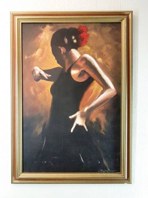 A beautiful Flamingo dancer by this very talented artist. This painting is stunning in every respect. The painting measures a large 88cm x 58cm and the frame measures 102cm x 72cm. A beauty to own, bid now!!