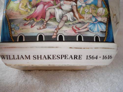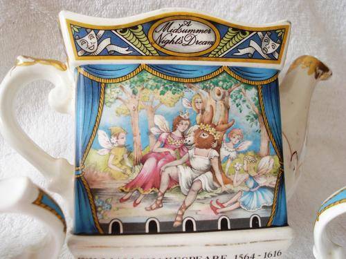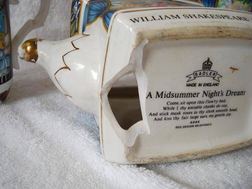 NO LID, AND THERE IS A PIECE MISSING FROM BOTTOM. A CHIP OR TWO ON THE MUGS AS WELL.