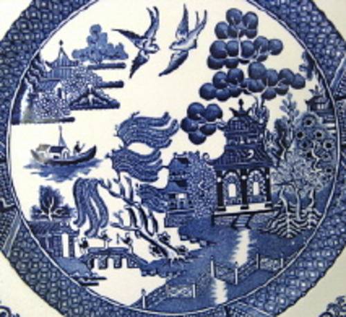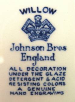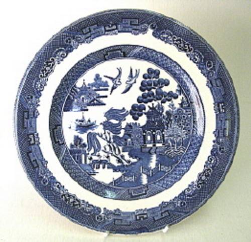 A willow pattern plate made by Johnson Brothers. No Chips or cracks but there are utensil marks from use. Diameter 225 mm.