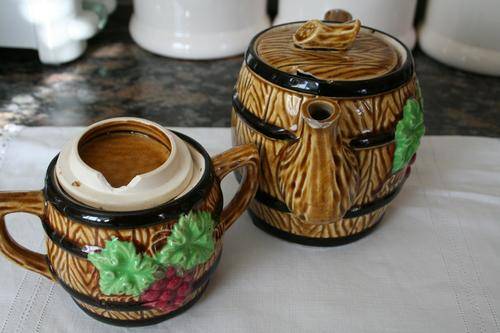 Rustic style wine barrel teapot and sugar bowl, with raised grapes on the front of each. Black handles around barrel top and bottom. No makers mark. Sugar bowl lid and collar chipped, Teapot spout chipped and lid glued. Please see pictures.