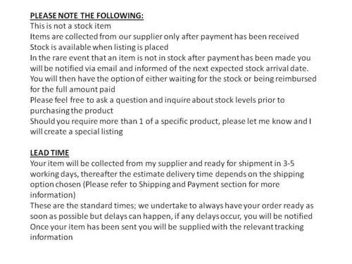 R35.00 Standard shipping using one of our trusted couriers applies to most areas in South Africa. Some areas may attract a R30.00 surcharge. This will be calculated at checkout if applicable.