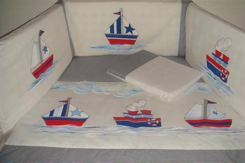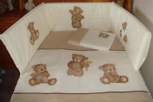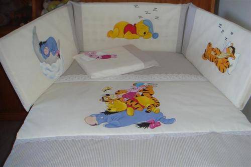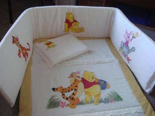 Unique and personalised sets. You can choose any character, theme and colour scheme from my library but, if you have something specific in mind let me know and I will make your dream come through. The sets consisting of cot comforter, cot bumper with inner and baby pillow are hand painted in 100% cotton.