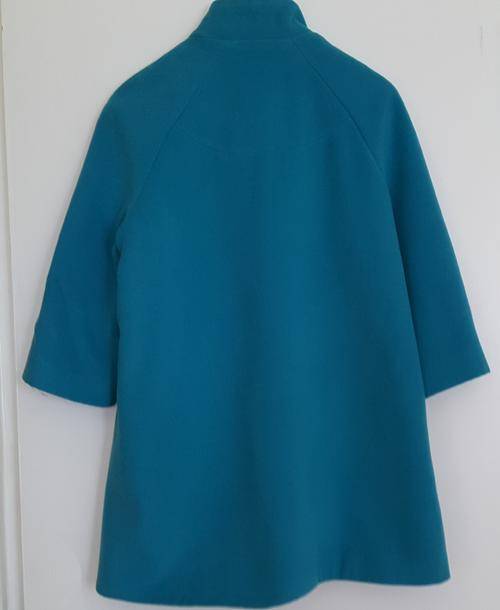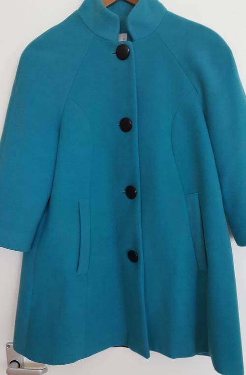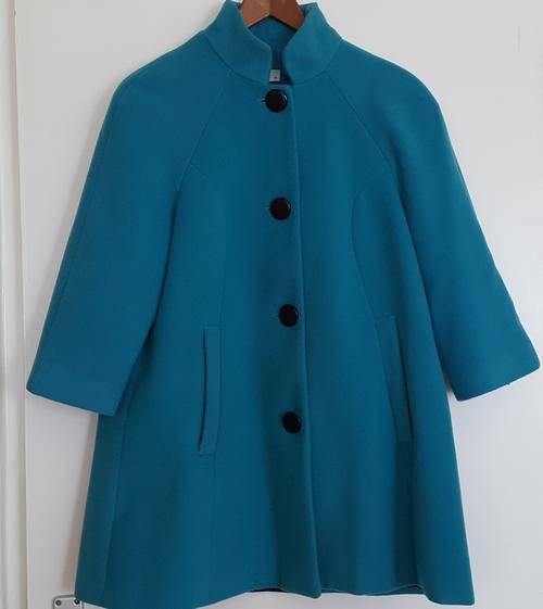 Stunning dark turquoise blue winter coat in opera style with mandarin collar, contrasting buttons and black lining. The jacket is by Merien Hall and is 70% polyester, 25% viscose and 5% spandex. Garment is in pristine condition. A show-stopping beauty. Size 34.