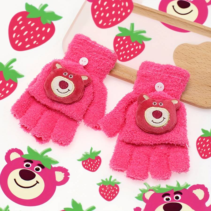 Disney Strawberry Bear & Three-Eyed Alien Flip Gloves, Thickened Coral Fleece Wa