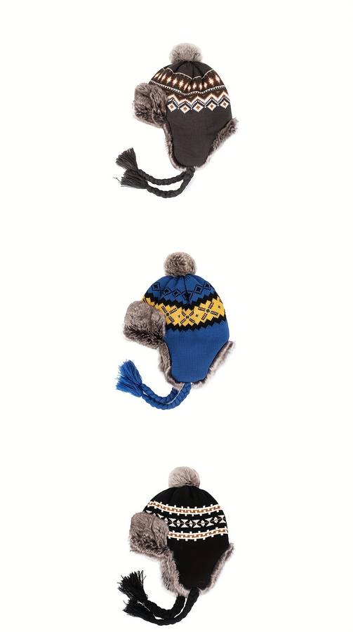 winter hat color Blue color Blue: Stretch Knit Plush Winter Hat with Detachable Ear Flaps & Pom-Pom - Grid Pattern Operation Instruction:Hand wash or professional dry clean