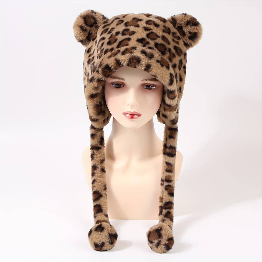 winter hat color Khaki size 54 58cm color Khaki:size 54-58cm Khaki Leopard Print Beanie Trendy Bear Ear Flap Hat Cute Cartoon Plush Hats Hall Suitable types:Inelasticity Special Features:Ear warmer Material:Polyester Cap Type:Furry Craftsmanship:Woven Random Type:random printing pattern position