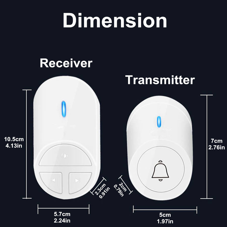 Features: ● Fit for home, apartment, classroom, office, villas and more. ● User friendly design, especially suitable for the elderly, women. ● It can be a paging device for the elderly, can signal for care when they need it most. ● With 60 music and 5 volume, meet your favorite music style, and volume requirements. ● Operating scope up to 300m in open area ensures you to hear the bell and answer the door in time. Specifications: Type: Smart Wireless Doorbell Material: ABS Color: Black / White (optional) Voltage: AC 110-220V Working Consumption: <0.5W Frequency: 433MHz Receiving Distance: 300M / 984FT (in open area) Ringtone QTY: 60 Volume: 5 Level Adjustable (0-85dB) Working Temp: -30 ~ +60℃ / -22 ~ +140℉ Outdoor Unit: 1x 12V 23A Battery (NOT included) Outdoor Unit: 7 x 5 x 2 cm / 2.76 x 1.97 x 0.79 in Indoor Unit: 10.5 x 5.7 x 2.3 cm / 4.13 x 2.24 x 0.91 in Indoor Unit: US Plug (we will send you the suitable adapter according to your location) Installation: ● Double-sided adhesive tape included for easy be fixed to the door frame of the transmitter. Easily plug receiver into an electrical outlet (no batteries required for main receiver). ● Install just plug it in location you need it to be heard, then you put the button where you want someone to push the button. Package Included: 1 x Indoor Unit (Plug-in Receiver) 1 x Outdoor Unit (Transmitter) 1 x Doorbell Sticker 1 x Double-Sided Adhesive Tape 2 x Screw 1 x User Manual (battery and other decorations NOT included) Detail Pictures: |