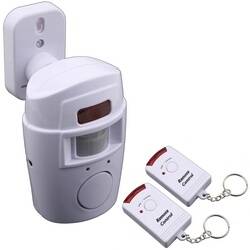 The Infrared Alarm has a 10 meter detection range and operates on 4 AA batteries, which are not included. Each of the remotes works at up to 20 meters and take three AG13 batteries, which are included. The alarm sounds at 105 dB.