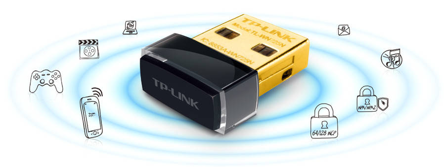 TP-Link's 150Mbps wireless N Nano USB adapter, the WN725N allows users to connect a desktop or notebook computer to a wireless network at 150Mbps. This miniature adapter is designed to be as convenient as possible and once connected to a computer's USB port, can be left there, whether traveling or at home. It also features advanced wireless encryption and easy installation.