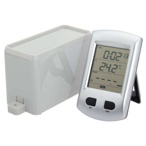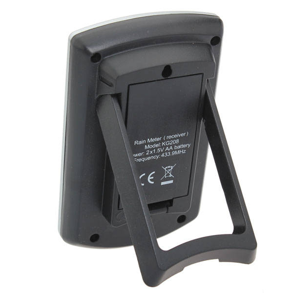 Description: Time zone setting. 12 or 24hour time mode. Indoor temperature(°C or °F). Wall hanging and free standing. Calendar(day-month-year display). Radio controlled time and date with manual setting option. Detail display of rainfall data in 1hour,24hour,week and total since last reset(user selectable in inch or mm). Specification : Temperature accuracy:+/-1.0°C Transmission frequency:433MHz Transmission range:Up to 100m(300feet) Rainfall display range:0 to 19,999mm Indoor temperature range:-10°C to +60°C Power requirement:Receiver:2X”AA”alkaline batteries(not included);Rain gauge:2X”AAA”alkaline batteries(not included) Package Included: 1 X Thermometer
