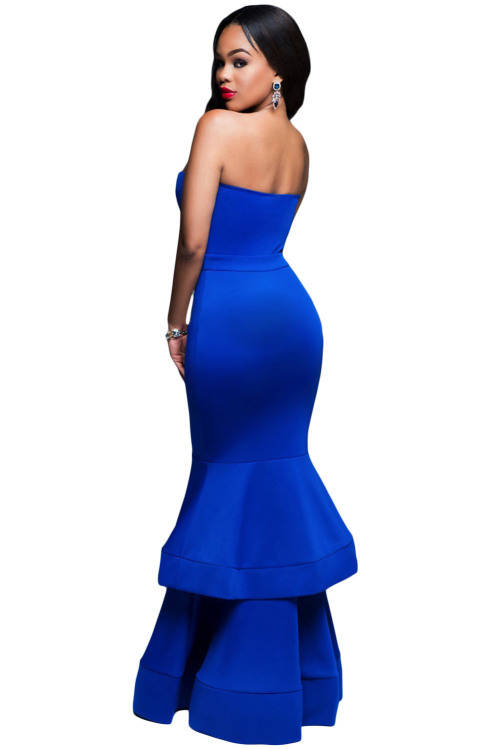 Women Blue Strapless Floor Length Flare Layered Hem Front Slit Evening Formal Matric Dance Dress