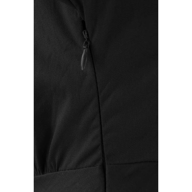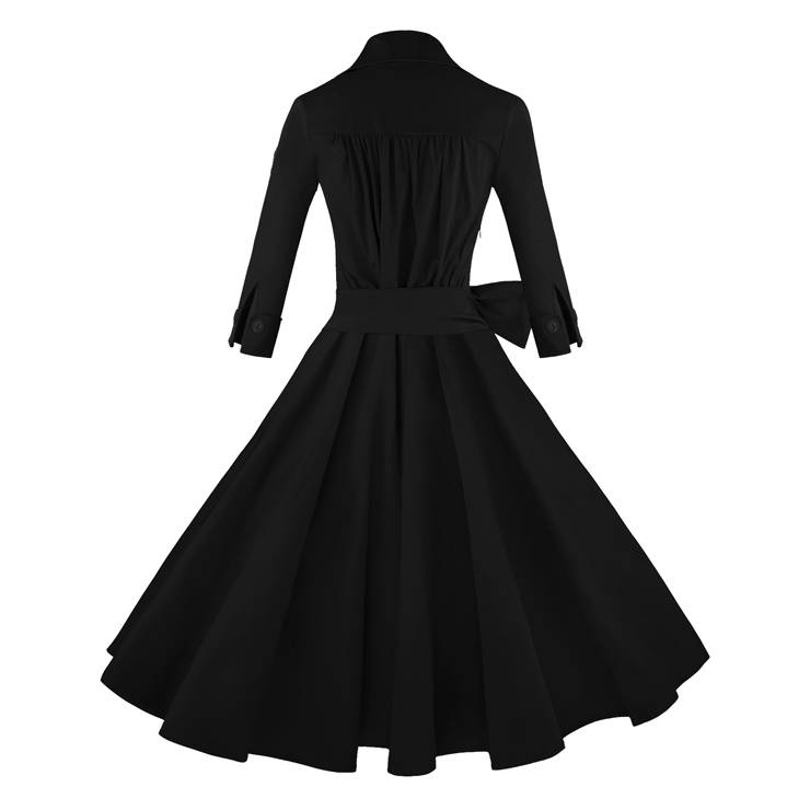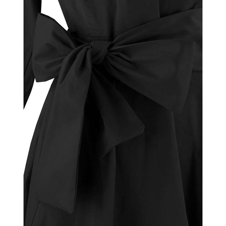 Womens vintage black dress, with turn-down collar deep-v neckline, 3/4 half sleeves with button, adjustable bow belt, unique swing hemline, fit for cocktails ball party.
