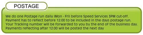 R65.00 Standard shipping applies to orders under R100.00, in most areas in South Africa. R35.00 Standard shipping applies to orders over R100.00. Some areas may attract a surcharge surcharge. This will be calculated at checkout if applicable. Check my rate