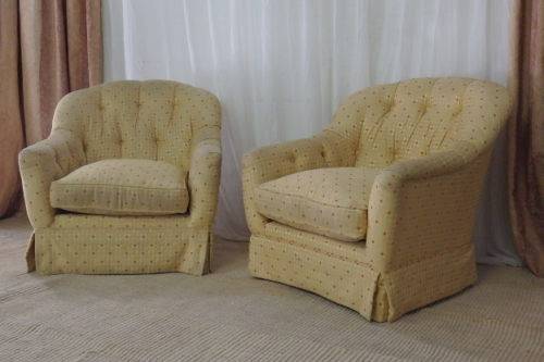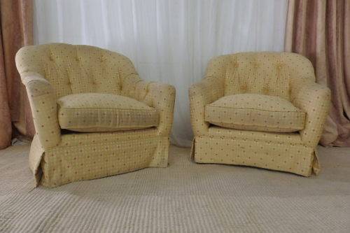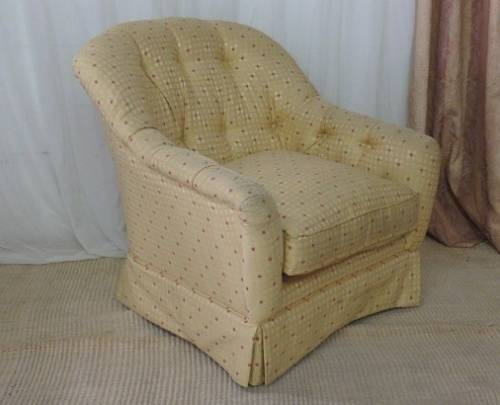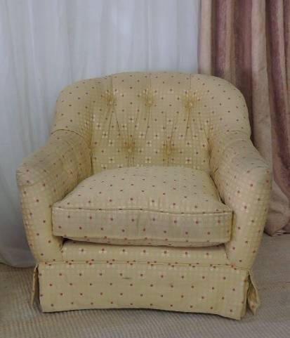 These wonderful and very comfy upholstered “Tub” arm chairs are the perfect relaxing/ chill chairs. Each chair measures 81cm long x 80cm wide x 80cm high and would look fabulous in a sun room or on a porch or even in a reading room or library. The chairs have a gorgeous yellow/ gold? and red upholstered fabric with a deep button padded backrest and armrests. The chairs do need a good clean, but the fabric is not torn or damaged. There is normal usage wear and tear. Please view the pics carefully for the general condition of the two armchairs.