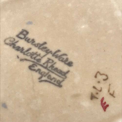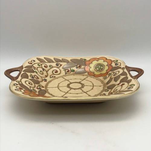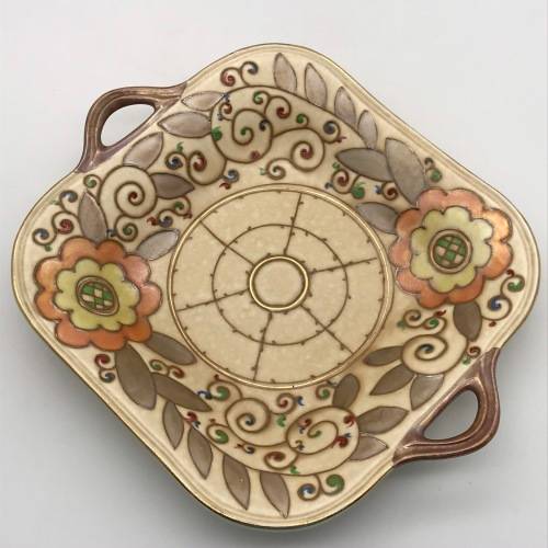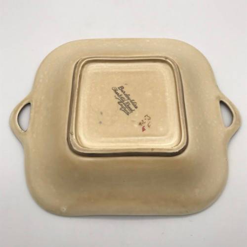 This very attractive, large, square dish with handles by 'Charlotte Rhead' (1885-1947), is beautifully decorated and tube lined in the 'Trellis' pattern with large orange and yellow flowers. It was made by 'Bursley Ware' (H.J Wood) in England, where 'Charlotte Rhead' became a director. It is signed on the base along with the pattern number 'T.L.3' and 'EF'. The dish is in excellent condition and measures 27.8cm x 22,8cm, with a weight of 630g.