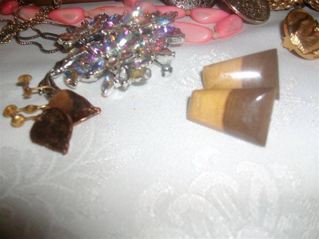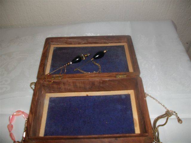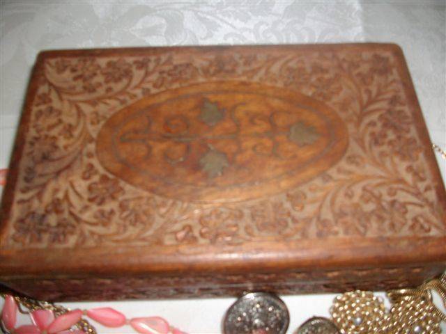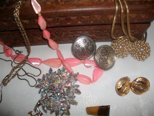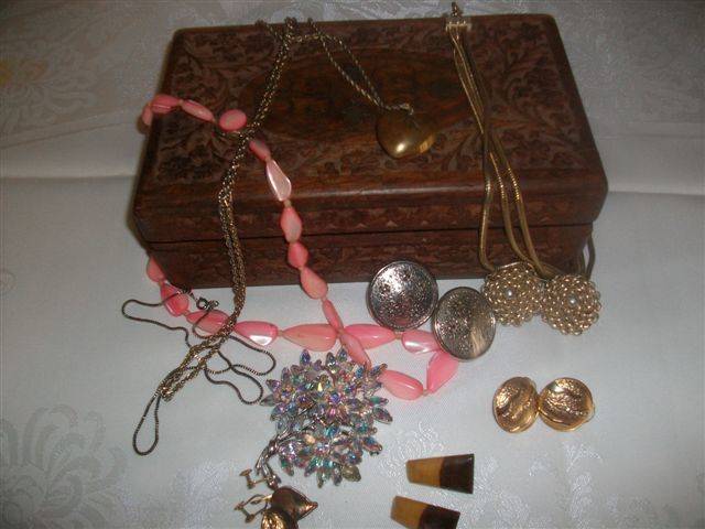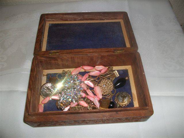 Wonderful vintage wooden box filled with some costume jewellery there is one brooch that seems to be missing a stone otherwise items are in good used condition as per pictures for one bid , postage will be R58please have a look at my other listings *free sprit* thank you
