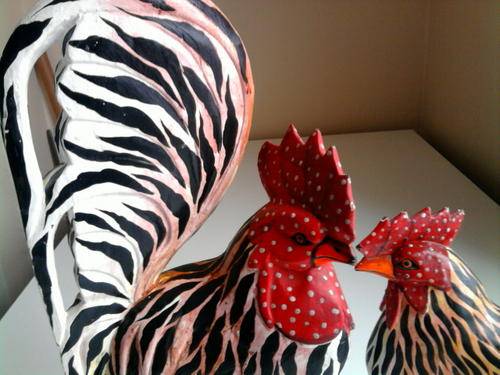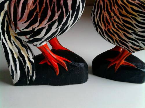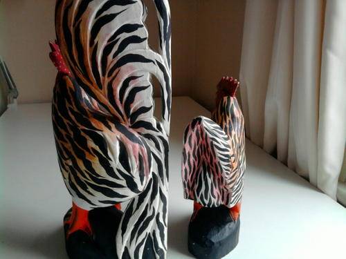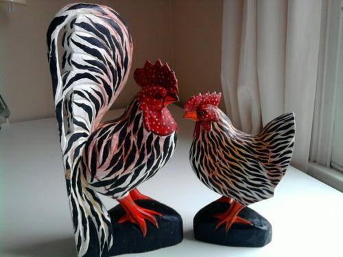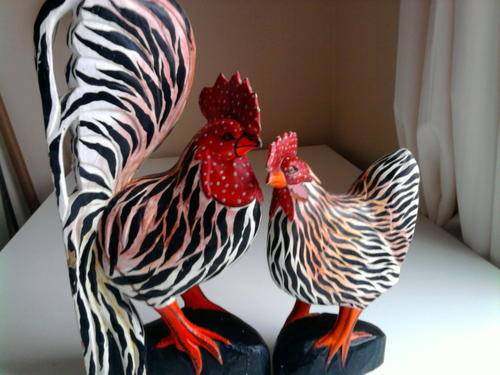 HUGE carved and hand painted wooden rooster and hen pair. Size of rooster 52cm high x 30cm wide and hen 33cm high by 22cm wide. Absolutely stunning! Real collectors' pieces!